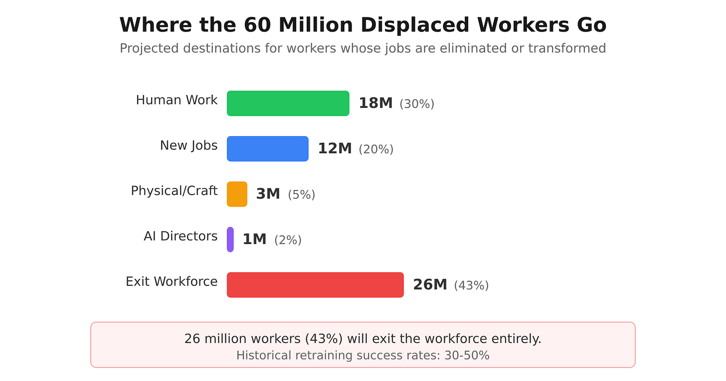 That last category is uncomfortable. Historical retraining success rates run 30-50%. Roughly 26 million who don’t find new work.