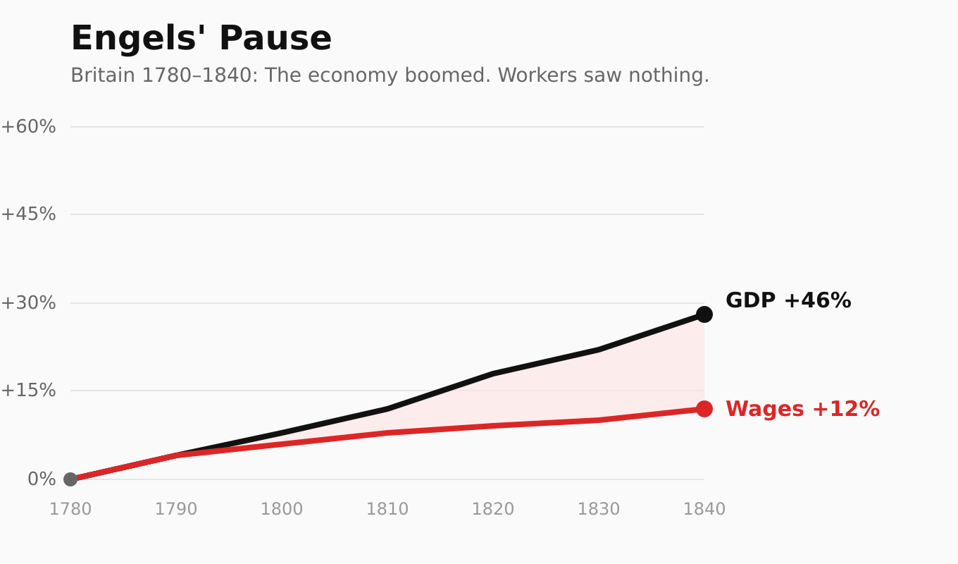 British workers experienced what economists call “Engels’ Pause”: from the 1780s to the 1840s, GDP grew 46% while working-class wages grew just 12%. Real wages stayed flat for 50 years before they finally rose.