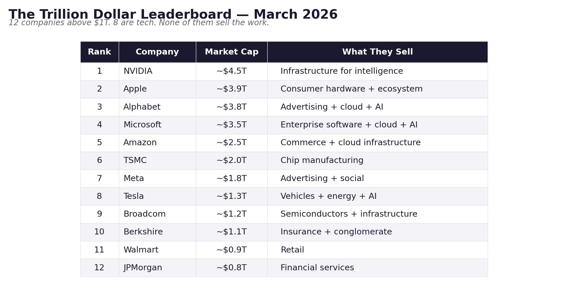 Twelve companies around or above a trillion. Eight are tech. Four are semiconductors or semiconductor-adjacent. The pattern is obvious. The market is betting on the infrastructure layer of the intelligence age.