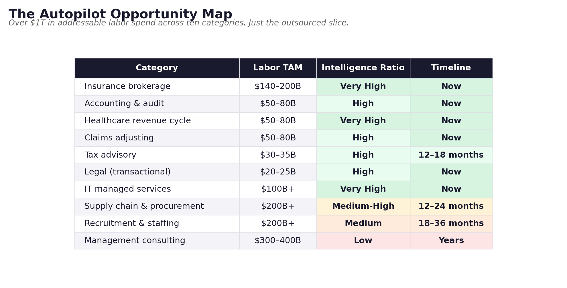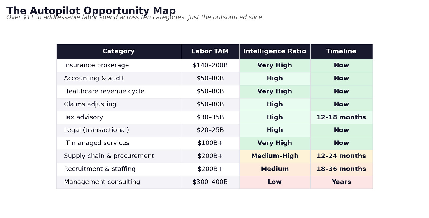 Add those up. That is over $1 trillion in addressable labor spend in just ten categories. And that is only the outsourced slice.